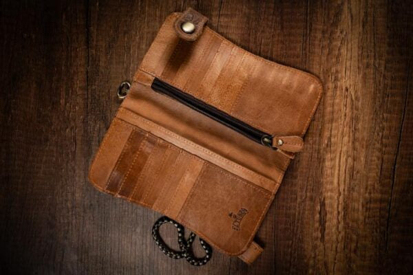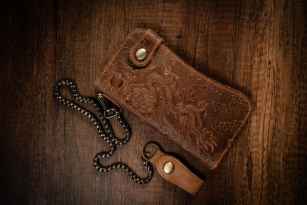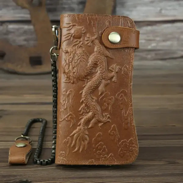 Billetera larga con relieve de dragon, y con cadena con medidas de 19cm x 10cm de cuero genuino